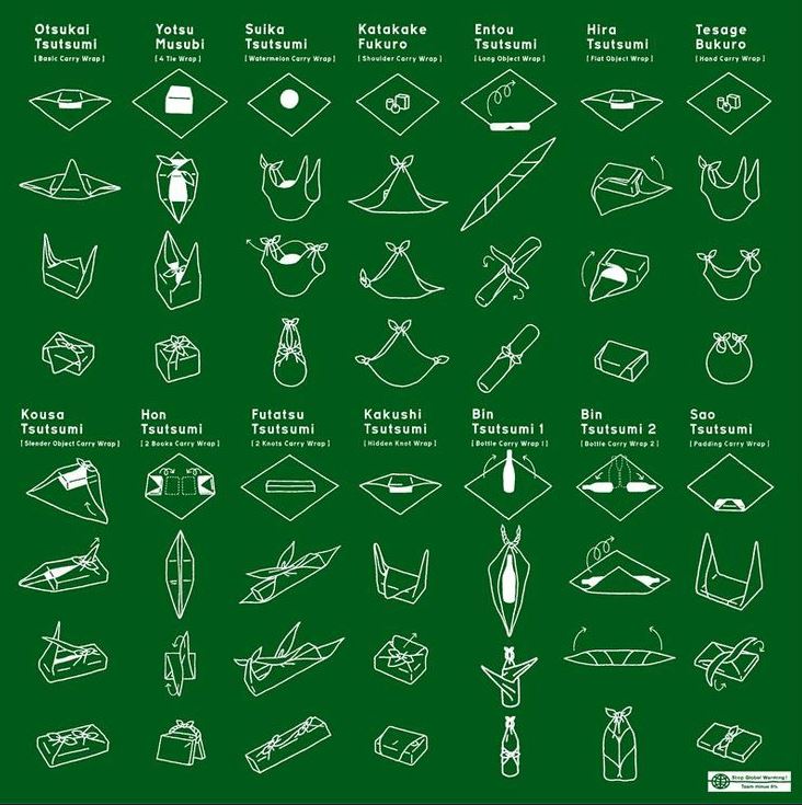 De nombreux pliages et nouages sont possibles en fonction de la forme de l'objet à emballer (boîte, objet rond, bouteille...) et également pour créer des sacs, petits et grands !